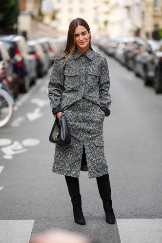 Серый уже сколько сезонов не уступает свое место и считается одним из самых «дорогих» оттенков в мире моды. Такой монохромный образ осенью и зимой всегда будет выделяться. Наденьте кашемировый светлый свитер, подберите к нему темно-серые брюки и накиньте на плечи шерстяное пальто-пиджак. Дополнить аутфит можно кожаной сумкой-шопером и шелковым платком.