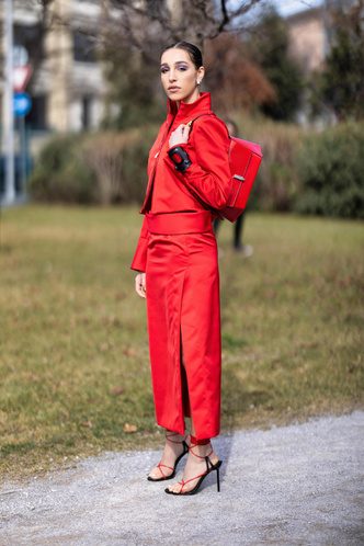 Красный — цвет, который покорил индустрию моды, сделав смелое заявление на подиумах по всему миру. Мировые марки включили карминовый оттенок красного в свои коллекции, представив брюки-карго, платья-комбинации и пальто. Приталенные костюмы-тройки, как у Ferragamo, платья свободного кроя, как у Lanvin, пушистые бомберы, как Palm Angels, и плюшевые шубы Stella McCartney — выбирайте алый тотал-лук, если любите быть в центре внимания.