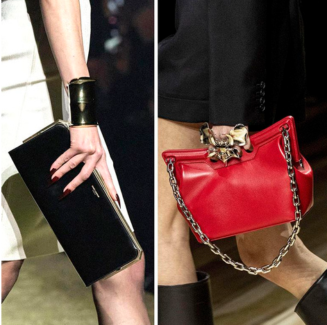 Chanel представили миниатюрные сумки на цепочке, а вот Gucci, например, сделали классический кожаный ремешок и дополнили его крупной акцентной цепью под цвет пряжки, которую можно также одеть на плечо. Нравится нам и прием в коллекции Alexander McQueen: объемный клатч с отверстиями под пальцы украшает крупная цепь, использовать которую по назначению нам совсем не хочется.
