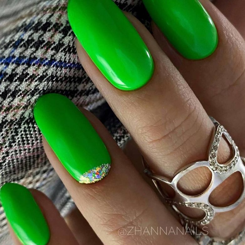 Однотонный салатовый маникюр – это ваш стильный лук на каждый день. Такой оттенок одинаково хорошо смотрится на коротких, длинных, овальных, острых и других формах ногтей. Салатовый оттенок сам по себе самодостаточный и яркий, поэтому в дизайне можно отказаться от любых деталей, но некоторые дамы все же выделяют один ноготок красочными стразами или блестками.