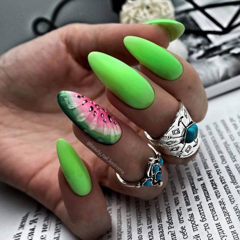 Летний, сочный и самый крутой маникюр – это салатовый общий тон, ягоды или фрукты. На таком ярком оттенке отлично получаются арбузы, киви, апельсины, лимоны, малина, клубника. Обязательно попросите мастера нейл-арта, чтобы он добавил в маникюр капли воды, которые смогут выделить модный дизайн.