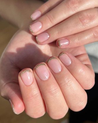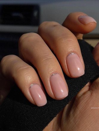 Еще один минималистичный вариант маникюра с блестками. Чтобы его повторить, вам нужно всего лишь сделать нюдовый маникюр, а затем провести ровную линию у самого основания ногтя вдоль кутикулы. Получается очень симпатичный нюд с оригинальным акцентом, который не бросается в глаза.