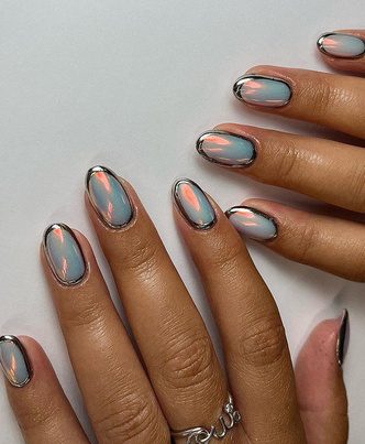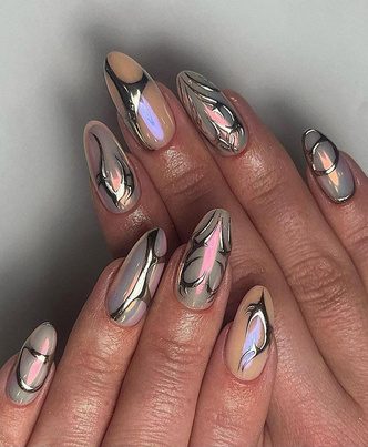 Поклонникам блестящего маникюра понравится дизайн в стиле металлик — этот нейл-арт сейчас на пике популярности. Вариантов много: от объемных узоров до необычных сочетаний с разноцветной втиркой. Также можно комбинировать металлик с матовой базой или «голыми» ногтями с прозрачной основой.