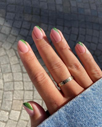 Еще один вариант минималистичного, но необычного дизайна для овальных ногтей — двойной френч. Этот нейл-арт визуально удлиняет пальцы и создает впечатление вытянутой ногтевой пластины. Цветовая гамма может быть любой: от насыщенных оттенков до нежно-пастельных