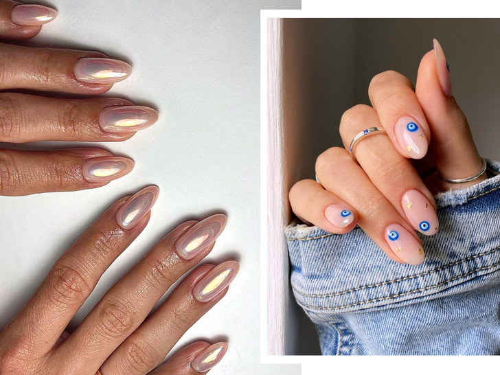 Французский маникюр идеально сочетается с ногтями овальной формы. Однако вместо классического или однотонного френча мы советуем сделать креативный дизайн. В этом нейл-арте важен баланс, поэтому в качестве основы лучше использовать нюдовыу оттенки. Попросите мастера нарисовать на свободном крае разводы или узоры — такой маникюр точно соберет множество комплиментов и не оставит руки незамеченными.