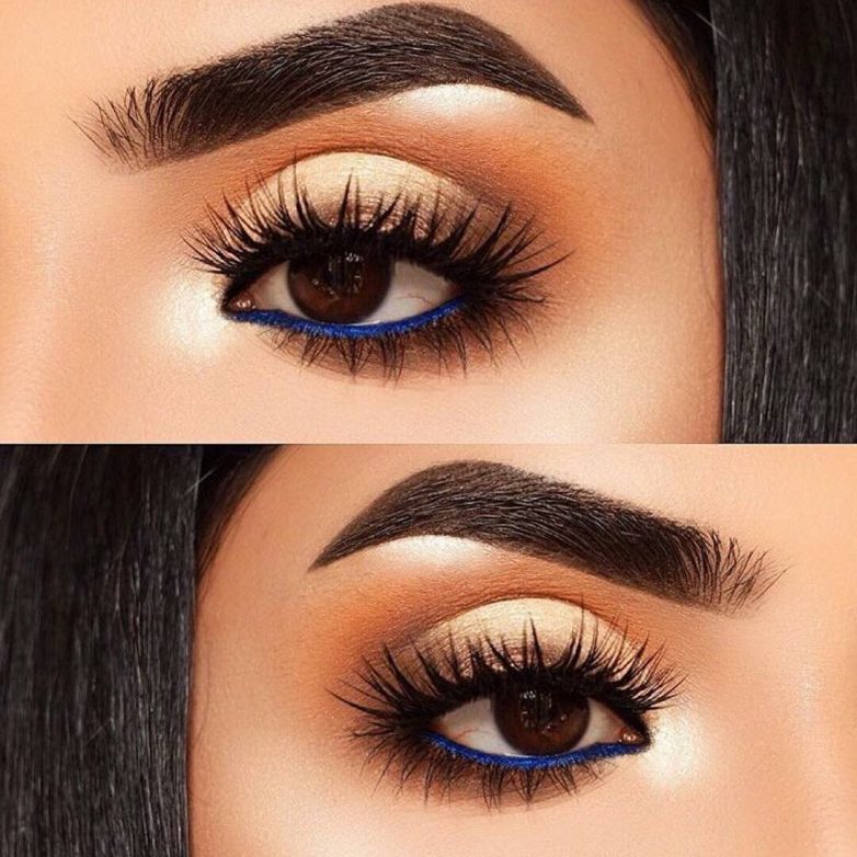 В этом случае достаточна растушеванная стрелка на верхнем векеи межресничная покраска. Задача заключается в создании правильного объема нижнего века. Для этого проводим тушевку светло-шоколадными тенями, расставляя акцент на середину века, немного ближе к внутреннему уголку. Светлые тени в нижнем уголке глаза распахнут взгляд. Не следует прорисовывать слизистую внешнего уголка выше подъема нижнего века.