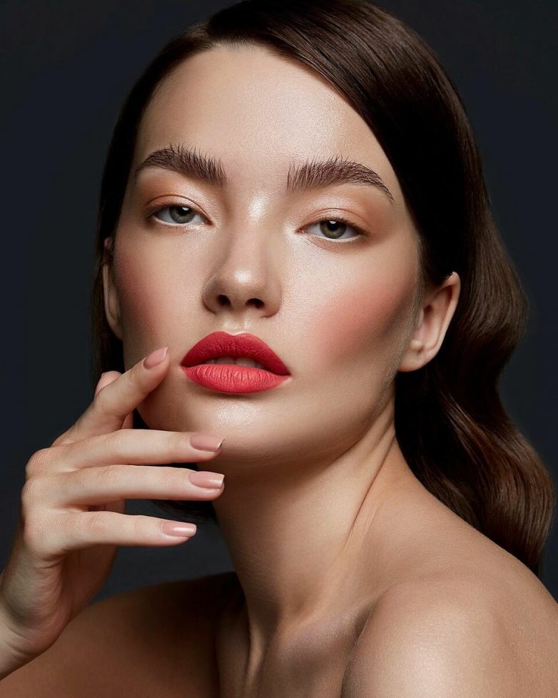 Целью макияжа должна стать коррекция верхнего века с использованием «вытягивающего» эффекта: толстые стрелки, тушь, придающая объем и хайлайтер под дугами бровей.