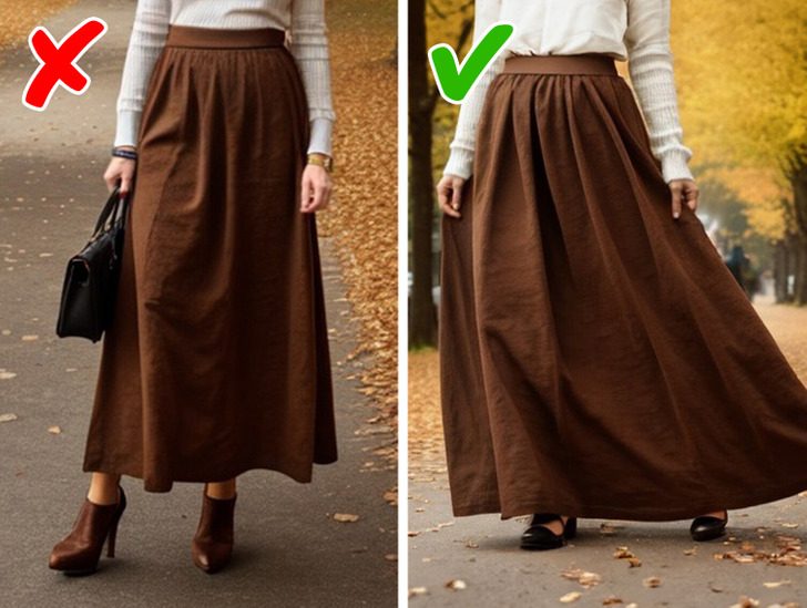 Юбка такой длины практически не выходит из моды, к тому же юбки-миди неплохо сидят на всех типах фигуры. Но если не подобрать к наряду подходящую обувь, такой образ прибавляет лет женщине. В сочетании с балетками и объемным свитером юбка может выглядеть несколько неряшливо, придавая дополнительный объем и скрывая все естественные изгибы тела.