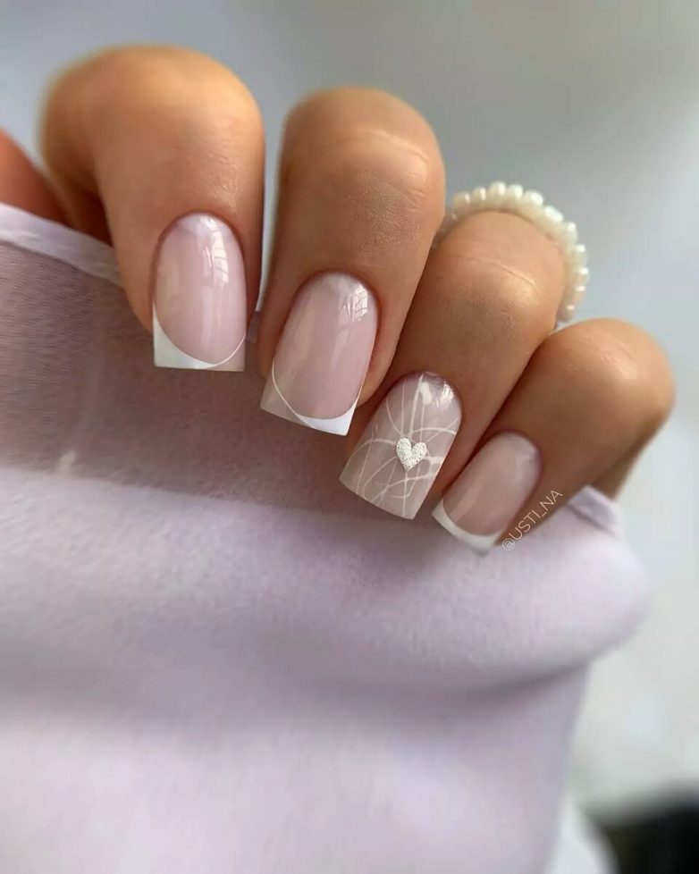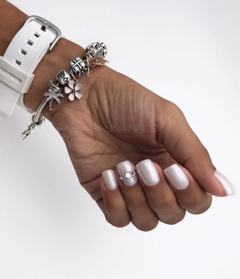 Интересно смотрится нежное покрытие ногтевых пластин, украшенное миниатюрными жемчужинами. Такой дизайн используют в свадебном, романтическом маникюре. Подобное украшение используют в лунном маникюре, в сочетании с негативным пространством.