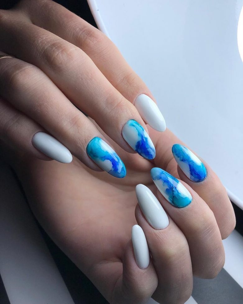 Этот дизайн нашел продолжение в осеннем маникюре. Идеально подходит к осени маникюр с блестящими кляксами на светлой ногтевой пластине.