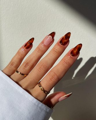 Этой осенью животный принт захватил все тренды. В этом варианте тоже можно поиграть с цветами и сделать интересные сочетания: белые крапинки со светло-коричневым или черные на рыжеватом фоне. Хищные пятна можно заметить у многих звезд, поэтому не бойтесь экстравагантности! К тому же, к такому принту подойдет любая форма ногтей.