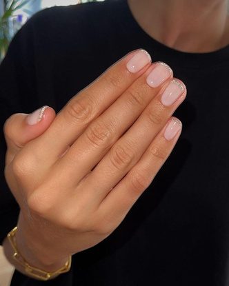 Нежный и женственный вариант френча — дизайн с объемными украшениями. Попросите мастера наклеить бусины у кутикулы или покрыть ногти блестками. Не переживайте за объемные вставки: если вы делали маникюр у квалифицированного мастера, украшения будут держатся долго. Также можно поиграть с цветом краев — все зависит от вашей фантазии!