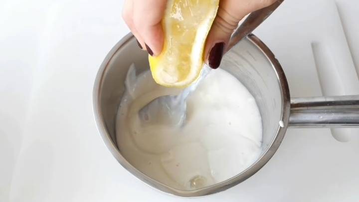 Сюда же выдавите 1 ч. л. лимонного сока (опционально; если ваша кожа агрессивно реагирует на кислоты, то можно не добавлять).