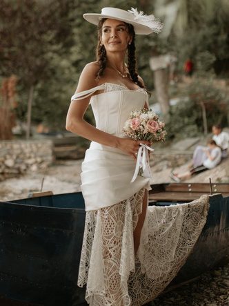 Звезда сериалов «Ветреный» и «Легенда», актриса Эбру Шахин поразила фанатов своим свадебным платьем. Девушка выбрала весьма открытый наряд, в котором переплелись элементы различных стилей: минимализм плотного верха с открытыми плечами и романтизм узорчатого кружева в пол. Вишенкой на торте стала белая шляпка, которую актриса кокетливо о надела чуть набок.