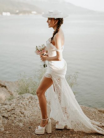 Звезда сериала «Великолепный век», актриса Гезде Туркер, выбрала для своей свадьбы длинное белое платье с ассиметричным вырезом на одном плече и открытой спиной. Украшают наряд стразы и кристаллы. Волосы невесты собраны в высокий хвост, в который вплетена длинная фата-шлейф. Получилось нежно, но в то же время строго и без лишнего пафоса. Надо сказать, что выбор актрисы оказался весьма удачным, что подтверждает восторженный взгляд жениха.