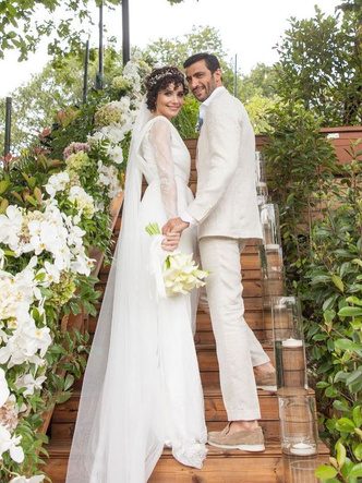Лаконично и со вкусом — такого принципа решила придерживаться на своей свадьбе киноактриса Сонгюль Оден, звезда сериала «Жемчужина». Ее платье — это воплощение элегантности: строгий фасон, плотная ткань, длинные прозрачные рукава. Кудри актрисы украшает цветочная диадема из кристаллов. Актриса не забыла и про фату, которую она закрепила на затылке.