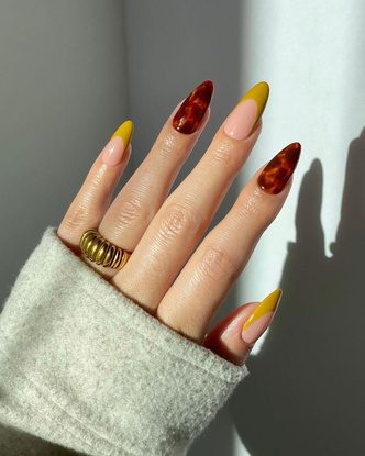 На смену классическим животным принтам, леопардовому и тигриному, приходит более необычный нейл-арт — черепаховый. Также такой маникюр часто называют янтарным — рисунки на ногтях очень напоминают узор на камне. В отличие от леопардового нейл-арта такой дизайн подходит ногтям любой длины и никогда не выглядит вызывающе. А сочетать его можно с другими оттенками «осенней» палитры — горчичным, оранжевым и коричневым лаками.