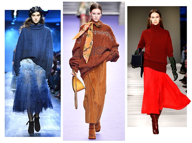 Пожалуй, самый популярный комплект сезона с трикотажем (в данном случае — с джемпером) в главной роли. Если на первый взгляд вам кажется, что такое сочетание вещей не оставляет простора для фантазии, спешим разуверить, вариантов звучания — масса: от повседневного, с лаконичными свитерами и юбками, как у Max Mara и Victoria Beckham, до торжественного, с юбками, больше напоминающими пачки балерин, как у Temperley London и Christian Dior. Какой бы из вариантов не пришелся вам по душе, вы получите очень женственный и романтичный аутфит.