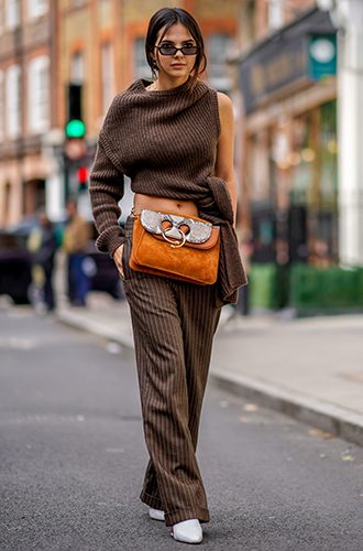 Радуйтесь, противники массивной одежды в холода, перед вами — зимний вариант кроп-топа. Конечно, погодные реалии нашей страны не позволят повторить смелые образы с открытым торсом с показа Fendi, поэтому к такому джемперу все же лучше выбирать юбку или брюки с завышенной талией. Хорошо будет смотреться и накинутый сверху жакет (при условии, что свитер не слишком плотный), и сарафан, тоже надетый сверху, например, вельветовый или из мягкой кожи.