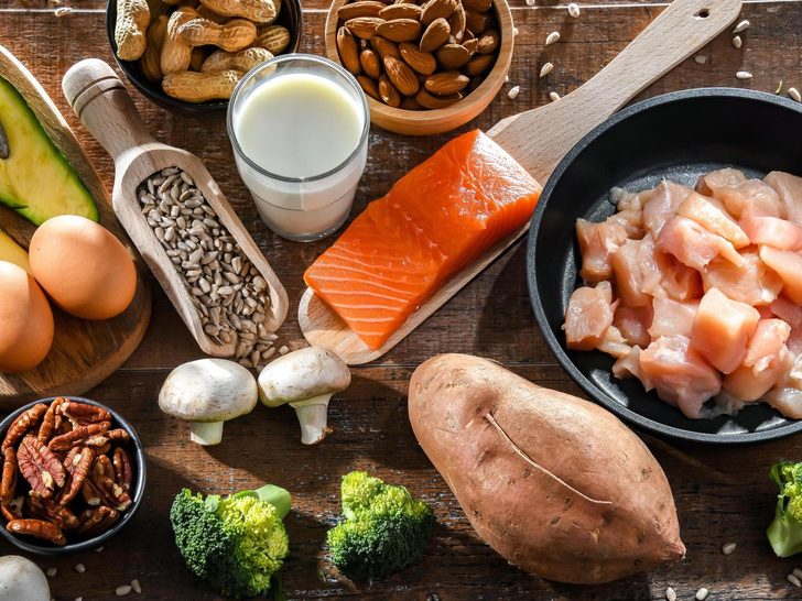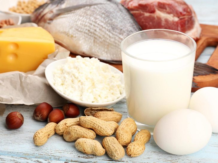 Продукты, богатые белком: мясо, птица, рыба, яйца, молочные продукты, соя, бобовые, фасоль, чечевица, орехи, семена и цельнозерновые продукты.