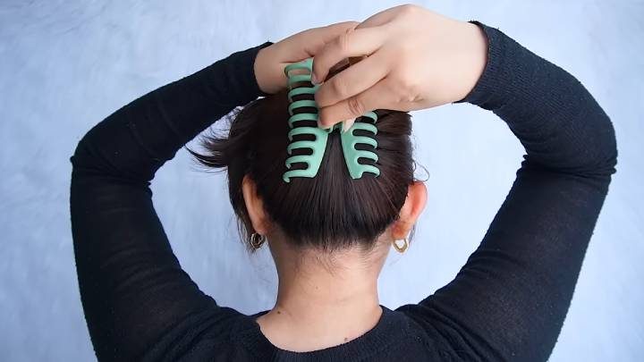Расчешите волосы, соберите в хвост. Запрокиньте волосы вперёд, зафиксируйте крабиком.
