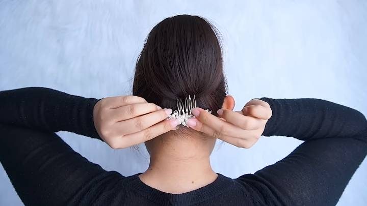 Украсьте причёску снизу декоративной шпилькой. Расправьте волосы аккуратно, чтобы они ровно легли на крабик и закрыли его со всех сторон.