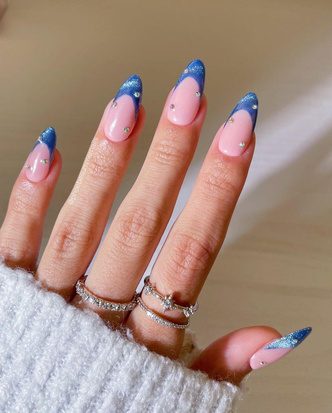 Вариантов блестящего френча очень много — от «кошачьего глаза» до светоотражающего лака. Какой бы дизайн вы не выбрали, французский маникюр будет выглядеть эффектно и элегантно, дополняя ваш образ для новогодней ночи. Блестки также можно сочетать с рисунками звезд, объемными стразами и жемчугом.