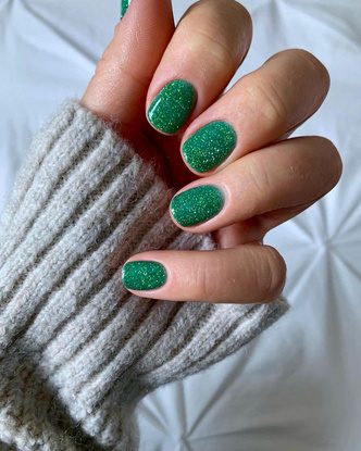Блестящий лак или топ с глиттером — самый простой способ сделать праздничный маникюр без особых усилий. Блестки выигрышно сочетаются с любым оттенком лака. Но если боитесь прогадать, выбирайте трендовые цвета этой зимы — зеленый, темно-синий, серебряный, вишневый и черный. При желании вы также можете дополнить маникюр любимым нейл-артом.
