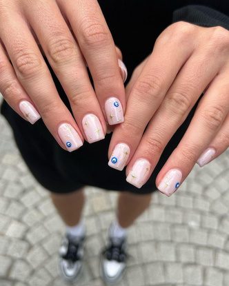 Блестящим лаком также можно нарисовать на ногтях небольшие звезды — такой дизайн гармонично сочетается с нюдовым покрытием, френчем и эффектом «голого» ногтя. Нейл-арт понравится поклонницам минималистичного дизайна, которые не любят перегружать ногти различными элементами.