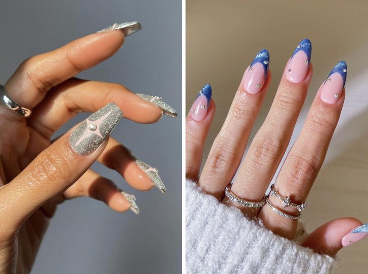 Пожалуй, это один из самых эффектных и фотогеничных маникюров в подборке. Светоотражающие лаки будут сиять ярче гирлянд на новогодних фотографиях и видео, а ваши руки соберут сотни комплиментов на празднике. Вы можете как полностью покрыть ногти блестками, так и сочетать их с другими нейл-артами, например, французским маникюром, небольшими объемными элементами и рисунками.