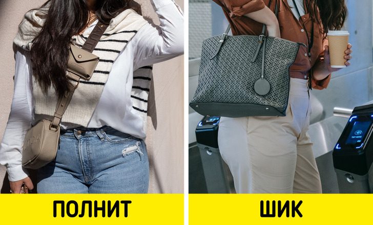 Избегать клатчей и сумок с короткими ручками, ведь они притягивают взгляд к верхней части фигуры.