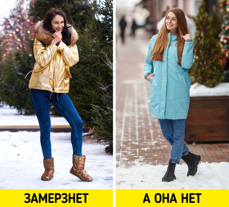 Джинсы скинни, даже если внутри есть утепляющая подкладка, это не самый оптимальный выбор для прогулок в мороз. Гораздо эффективнее будет, если надеть теплые колготки и сверху более свободные брюки, чтобы между слоями ткани образовалось пространство для циркуляции воздуха, который будет сохранять тепло кожи.