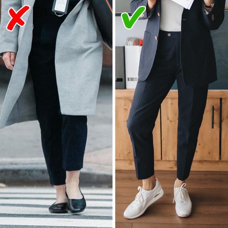 Такую неудобную обувь вполне можно заменить на кеды или кроссовки, которые теперь вполне можно носить и в офисе. Главное подобрать однотонные простые модели, которые будут одинаково хорошо смотреться и с брюками, и с юбкой. Если же вы рискнули выбрать яркую обувь, можно попробовать подобрать к ней какой-то элемент в тон — например, шарфик. Желательно, чтобы в наряде присутствовал хотя бы один элемент классического кроя: пиджак, брюки со стрелками или рубашка.