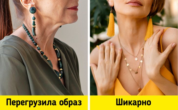 Равноценные по блеску, цвету или величине серьги и ожерелье могут перегружать образ. Лучше сделать акцент на чем-то одном. Например, выбрать яркое ожерелье и маленькие сережки или наоборот. Еще можно создать контраст с помощью яркого цветного и более «спокойного» украшения.