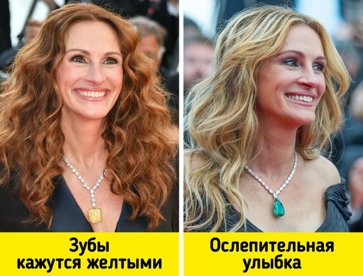 Драгоценные камни красных и синих оттенков контрастируют с естественным желтоватым цветом эмали и могут визуально сделать зубы белее, а улыбку ярче. Таким же эффектом обладают блестящие украшения, особенно из белого золота и с бриллиантами. Но важно выбирать украшения без оранжевого отлива — они подчеркнут желтизну зубов.