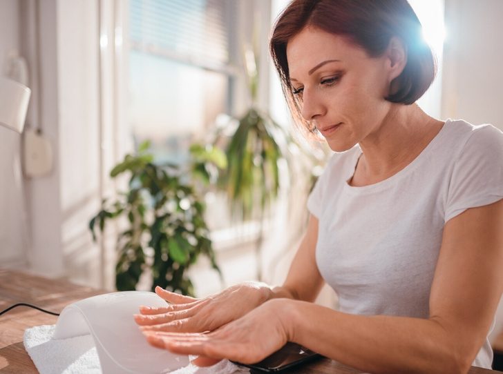 В качестве лайфхака для быстрой сушки лака часто советуют опустить ногти в холодную воду. На самом деле формула лака подразумевает, что он постепенно затвердевает под воздействием кислорода, а от контакта с водой только становится гуще. От этого создается впечатление, что лак высох, и мы спокойно приступаем к ежедневным делам. В результате на покрытии могут остаться отпечатки различных предметов, до которых мы дотрагиваемся, и постепенно застыть именно в таком виде.