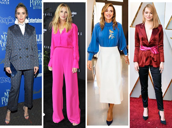 Отличный пример небанальных сочетаний брюк и топов можно подсмотреть у двух звездных красоток — Джулии Робертс и Розамунд Пайк.