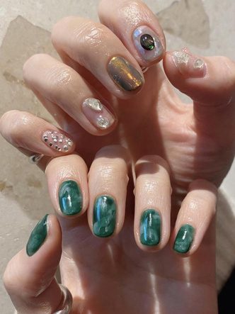 Стразы на всех ногтях — утяжеляют и, вопреки всеобщему мнению, сильно дешевят образ. К тому же, вычурность не понравится Зеленому Дракону, который предпочитает элегантность и лаконичность. Здесь стоит уточнить, что в экспериментах со стразами очень важно соблюдать стремление к минимализму, чтобы ваш маникюр не стал походить на дополнение к карнавальному образу. Поэтому стразы, особенно небольшие, могут стать отличным дополнением дизайна, главное не переусердствовать с их количеством. А вот от крупных страз и камней лучше отказаться, либо использовать в единичном варианте на одном или двух ногтях, в качестве акцентов в дизайне.