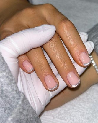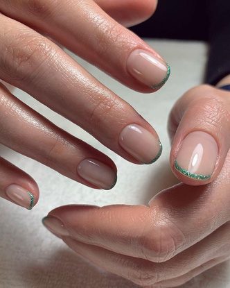 Если на душе праздник или вы просто любите добавлять акцентные элементы даже в классический повседневный маникюр, сделайте тонкую, едва заметную блестящую полоску френча. Она может быть как классической на свободном крае ногтя, так и тонкой двойной, что сделает маникюр еще более интересным. Добиться такого эффекта можно при помощи глиттера, блесток или страз. За счет базы в сливочных и кремовых оттенках, такой маникюр будет выглядеть деликатно, но сохранит за собой право на роскошь.