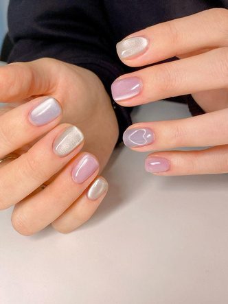 Дизайн для особого случая, когда хочется все и сразу. Дополните лак наклейками, рисунками или покройте ногти разными оттенками. Например, «кошачий глаз» можно дополнить минималистичными звездами, узорами и объемными украшениями. Главное — не переборщить. Выбирайте один акцент: либо яркий цвет, либо креативный дизайн с множеством деталей.