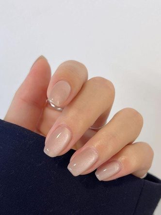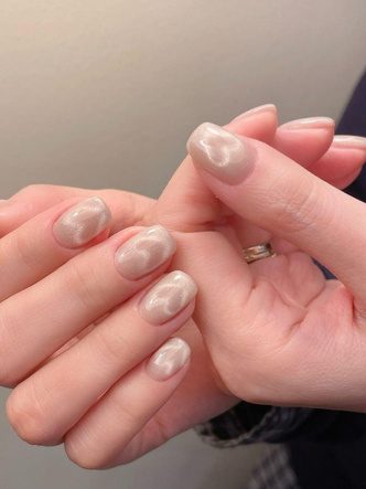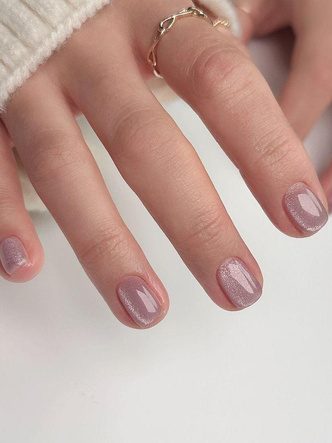 Вариант актуален для тех, кто не любит яркие оттенки в маникюре, но при этом устал от классического однотонного покрытия. «Кошачий глаз» в нюдовых оттенках станет хорошим дополнением повседневного образа: он выглядит сдержанно и нежно. При естественном свете, возможно, дизайн будет выглядеть как обычная втирка, а под лучами солнца или ярким освещением заиграет по-новому, переливаясь несколькими оттенками.