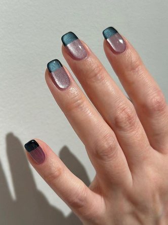 Если вы одинаково сильно любите и французский маникюр, и нейл-арт «кошачий глаз», выбирать между ними не придется. Эти дизайны гармонично сочетаются друг с другом. Свободный край можно прокрасить как обычным лаком, так и с помощью глиттера или светоотражающего геля. Вы также можете поиграть с контрастами, сочетая, к примеру, нюдовую и неоновую палитры.