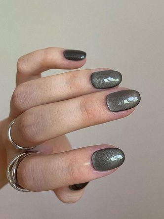 Дизайн также можно сделать в темных оттенках: черном, синем или зеленом. С помощью магнита мастер создаст на ногтях равномерный перелив от темного к более светлому оттенку — такой маникюр можно рассматривать бесконечно. Темный «кошачий глаз» можно дополнить небольшими украшениями и узорами, чтобы сделать маникюр более креативным.