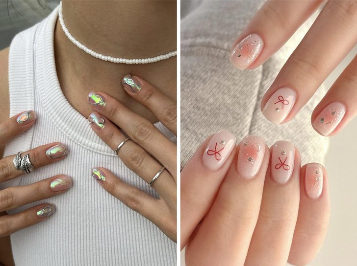Креативный способ соответствовать самому модному тренду сезона на женственность и утонченность — coquette core. Сегодня банты используют не только в одежде и прическах, но и в дизайнах маникюра. Варианты исполнения самые разные: глиттер, нюд и 3D- фигурки. С таким нейл трендом любой образ будет выглядеть нежно и модно.
