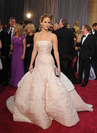 После того, как Дженнифер Лоуренс подписала контракт с Домом Dior, нарядами звезды для крупных мероприятий занимаются дизайнеры французского бренда. Однако если кто-то захочет повторить образ своего кумира, за аутфит придется выложить неплохую сумму. В 2014 году на церемонии «Оскар» звезда решила сделать ставку на красный цвет и выбрала лаконичное платье в пол без бретелей с баской. Стоимость такого лаконичного и стильного наряда, по разным оценкам, составляла $80 000.