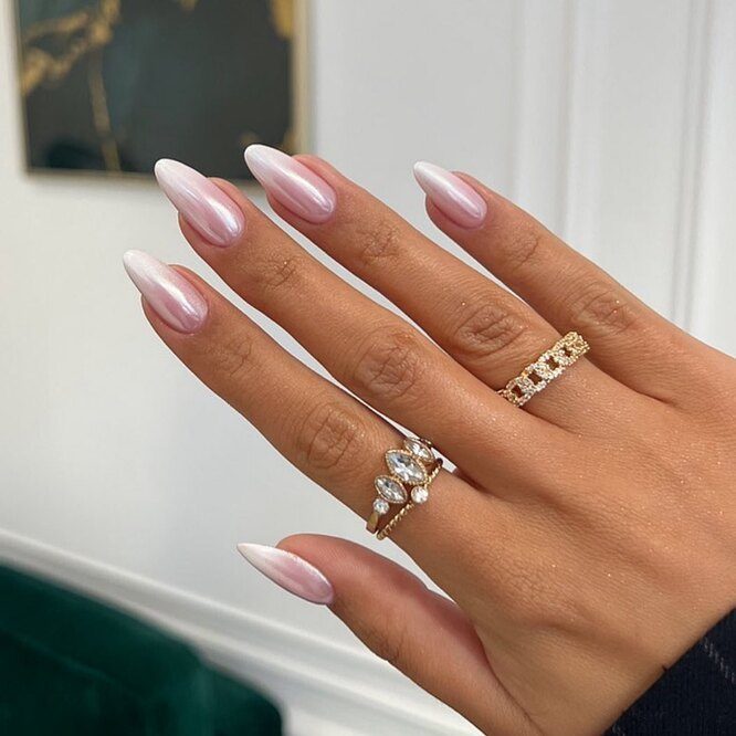 Лучше всего жемчужное покрытие ляжет на овальные, миндалевидные или ногти-стилеты средней длины. От мягкого квадрата в этом случае лучше отказаться: женственности твоим рукам в сочетании с сиянием розового жемчуга он точно не прибавит.