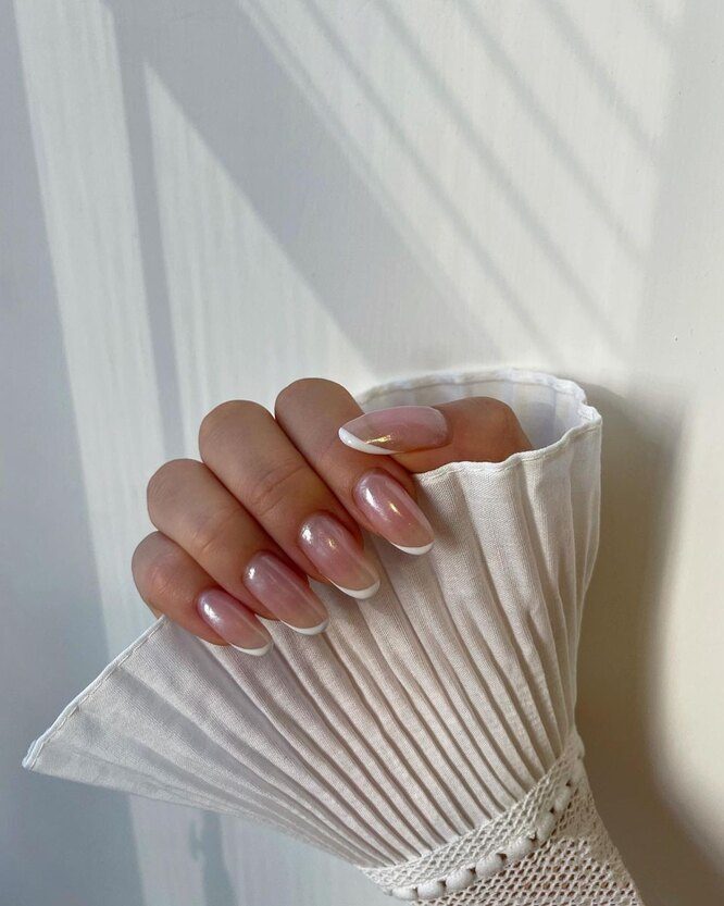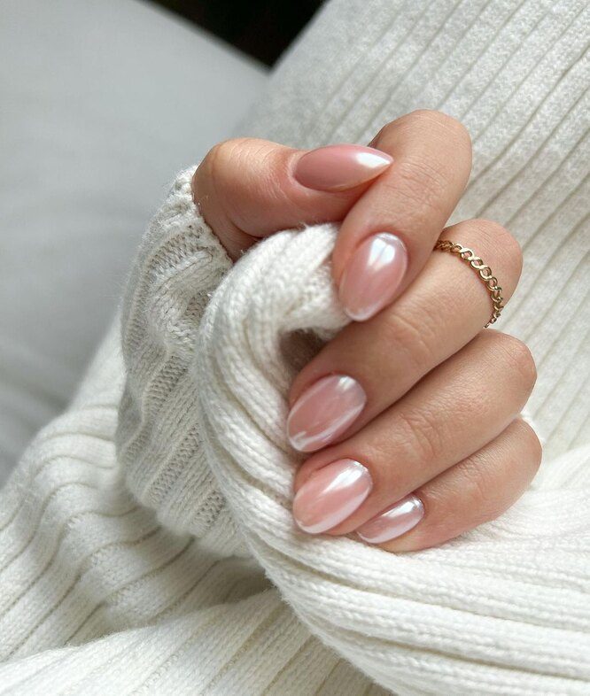 Теперь нюдовое покрытие на ногтях напоминает не глазурь на сладких пончиках, а, скорее, жемчужное напыление. Главная фишка этого маникюра в мягкой бледно-розовой основе, покрытой легким сиянием с завораживающим эффектом.
