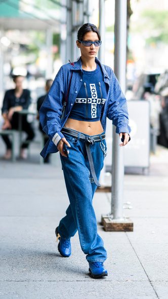 Джинсы и рубашка — одно из любимых сочетаний супермоделей всех времен. Вы можете выбрать в образе элегантность, как Синди Кроуфорд, и надеть объемную белую рубашку, расстегнув верхние пуговицы. А можете экспериментировать со стилем, как Белла Хадид: знаменитость сочетает модель «с мужского плеча» с укороченным топом и широкими синими джинсами на низкой талии.