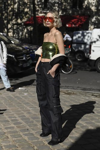 Предстоящей весной и летом будут актуальны утилитарный стиль и эстетика карго — данная тенденция главенствует в большинстве люксовых коллекций, поэтому можно продолжить формирование гардероба в этом направлении. Даже если тренд уступит ведущие позиции чему-то другому, такие брюки не потеряют своей актуальности. Они будут отлично смотреться с более прилегающим верхом. Можно добавить к ним ботильоны на каблуке и узкое полупрозрачное боди — получится потрясающий образ в духе Saint Laurent.