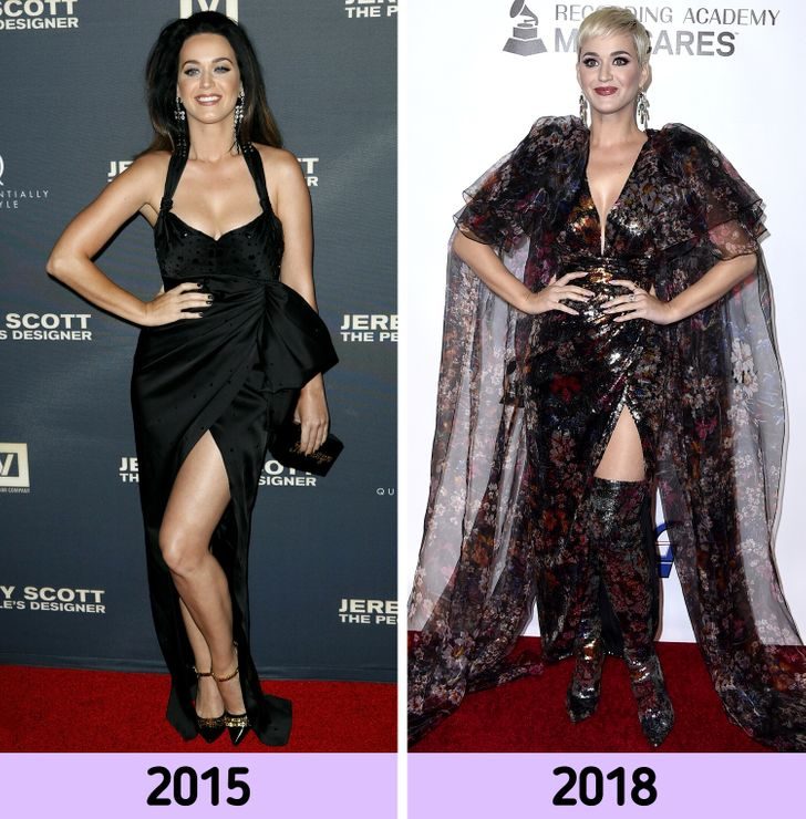 Кэти Перри сгибает одну ногу в колене и сводит плечи вперед